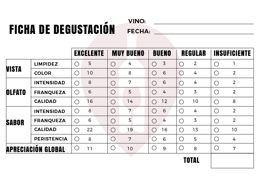 Los jueces disponen de una ficha de degustación por vino a degustar, la cual debe respetar los siguientes criterios, además de permitir valorar las muestras: