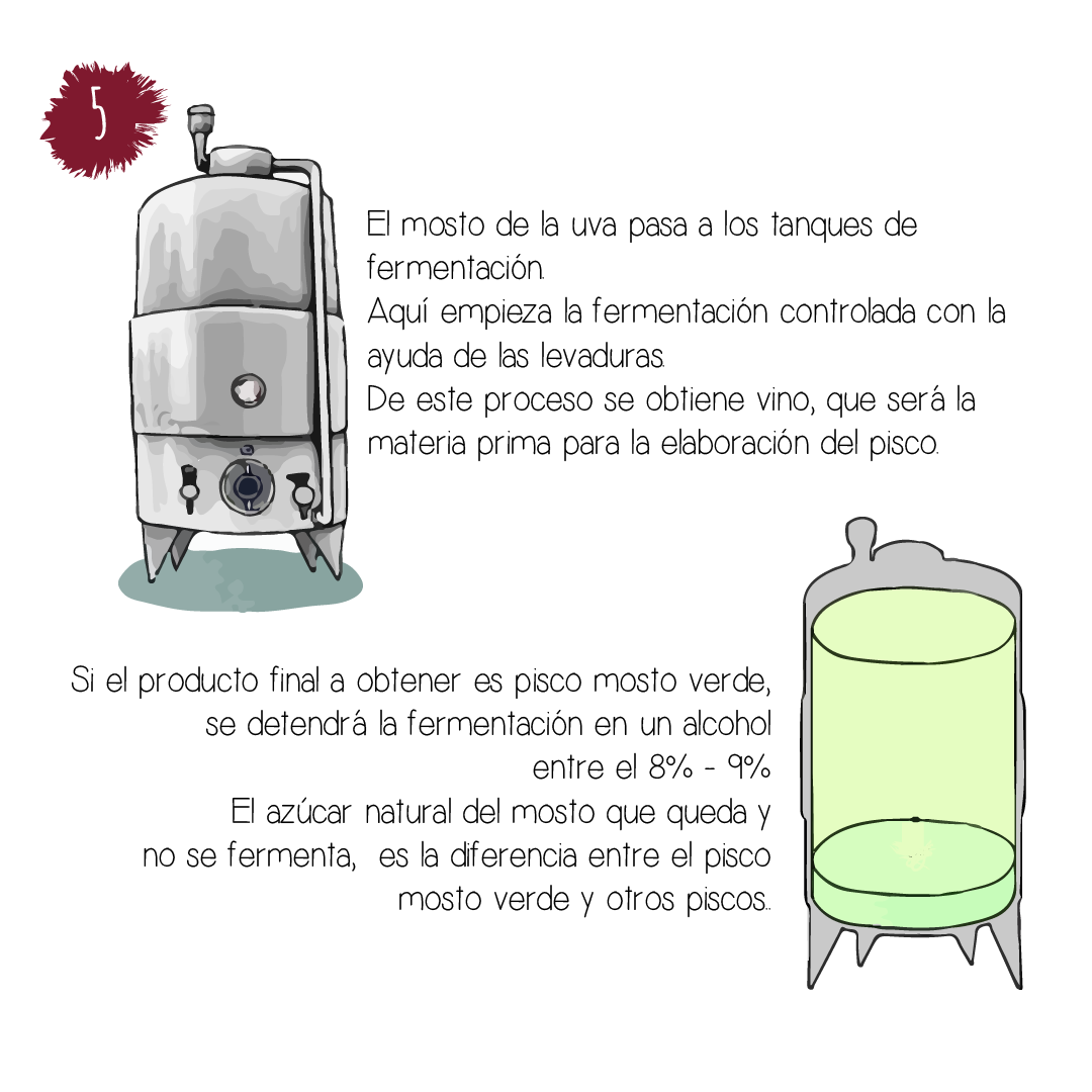 Pisco mosto verde: de una sola variedad de uva proveniente de la destilación de mostos frescos incompletamente fermentados, es obtenido tanto de uvas de las variedades no aromáticas como de las variedades aromáticas; en otras palabras, se destila el mosto antes de que todo el azúcar se haya transformado en alcohol, es por eso que requiere de una mayor cantidad de uva por litro de Pisco.